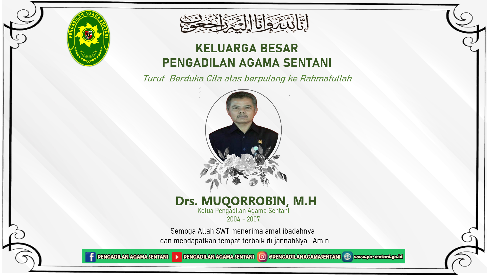 Turut Berduka Cita Atas Berpulang Ke Rahmatullah Ketua Pengadilan Agama Sentani 2004 - 2007 Written by KEPANITERAAN on 08 July 2021. Written by KEPANITERAAN on 08 July 2021. Hits: 1049 Turut Berduka Cita Atas Berpulang Ke Rahmatullah Ketua Pengadilan Agama Sentani 2004 - 2007