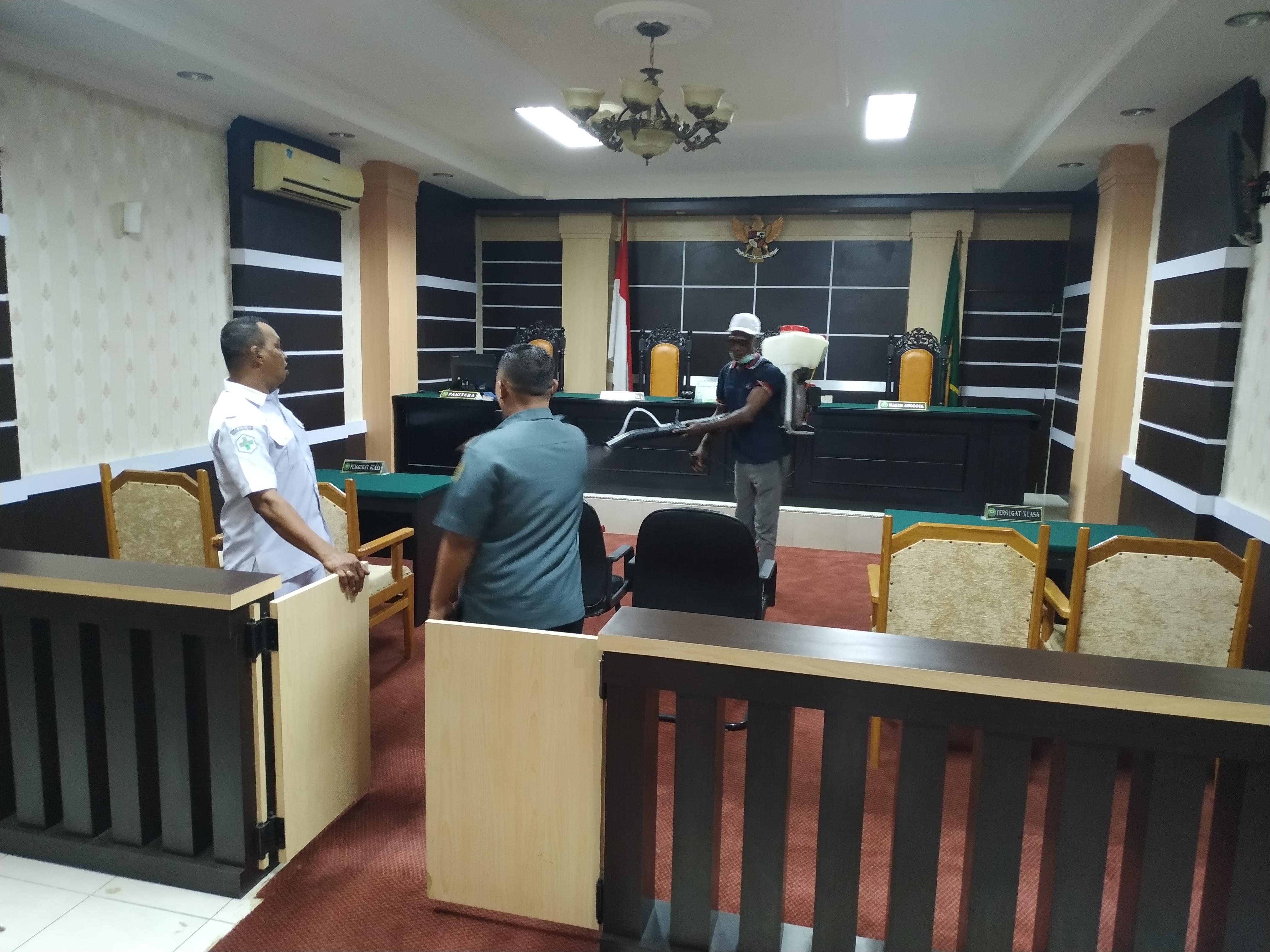Proses penyemprotan dimulai dari Luar gedung PA Sentani, lalu menuju ruang hakim, media center dan ruang pimpinan yang berada pada lantai 2 gedung. Kemudian pada lantai 1 gedung yang terdiri dari Aula, Ruang Kesekretariatan, ruang Kepaniteraan, Area Pelayanan dan terakhir pada Musholla Kantor. Selama proses penyemprotan dilakukan, Sekertaris dan Kasubag Umum dan Keuangan turut mengawasi sekaligus mendampingi petugas yang melakukan penyemprotan.